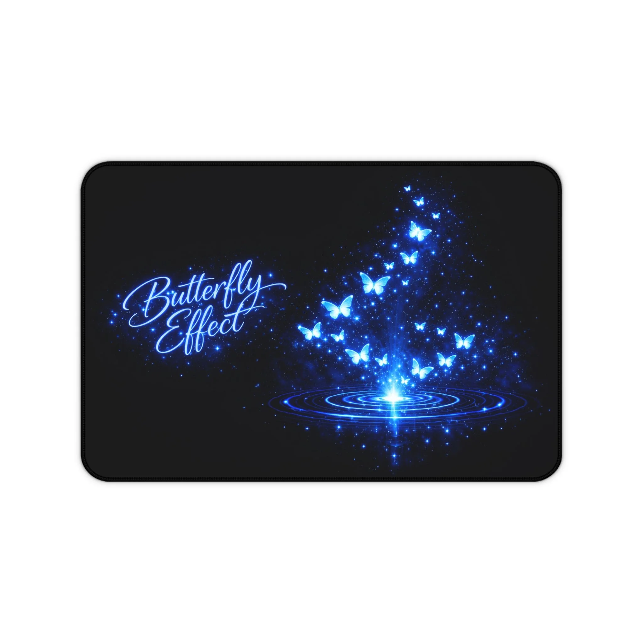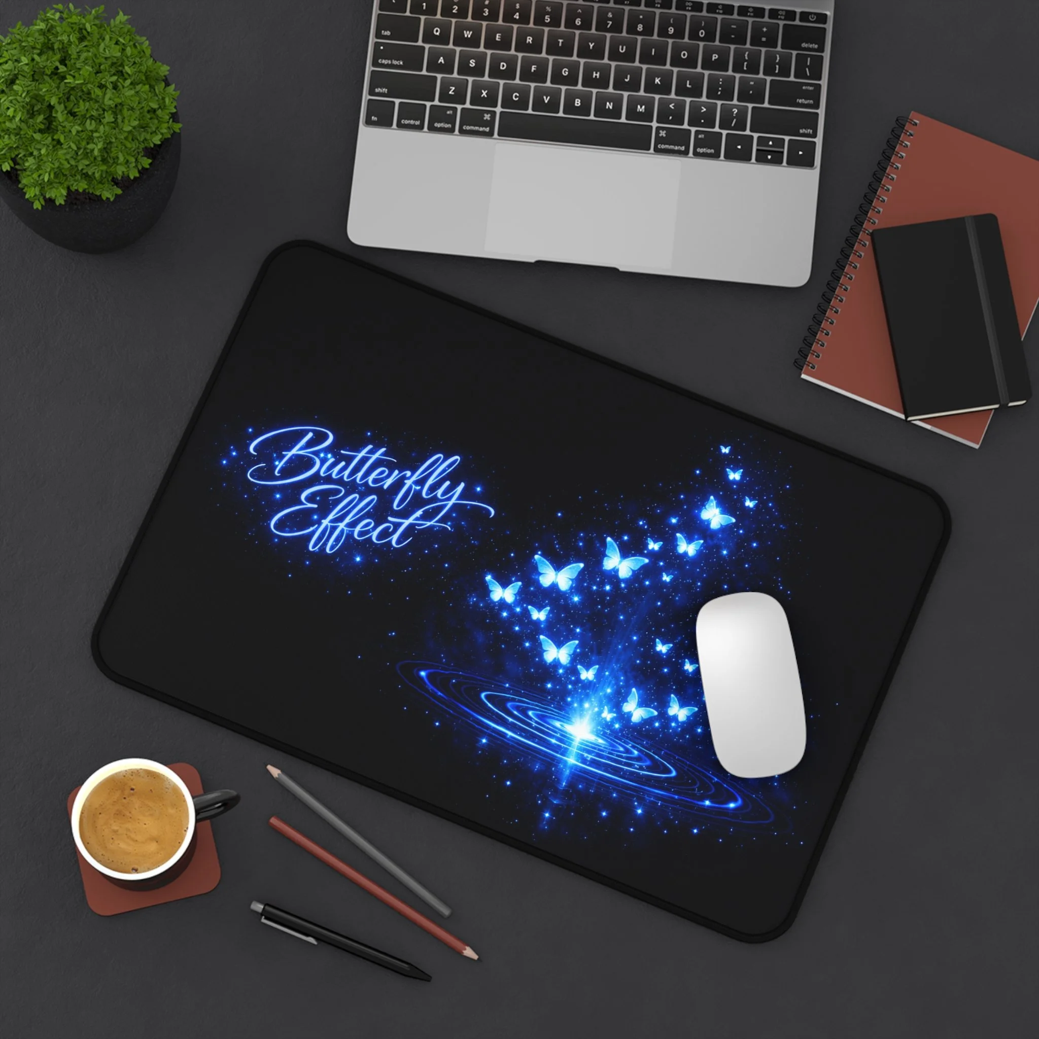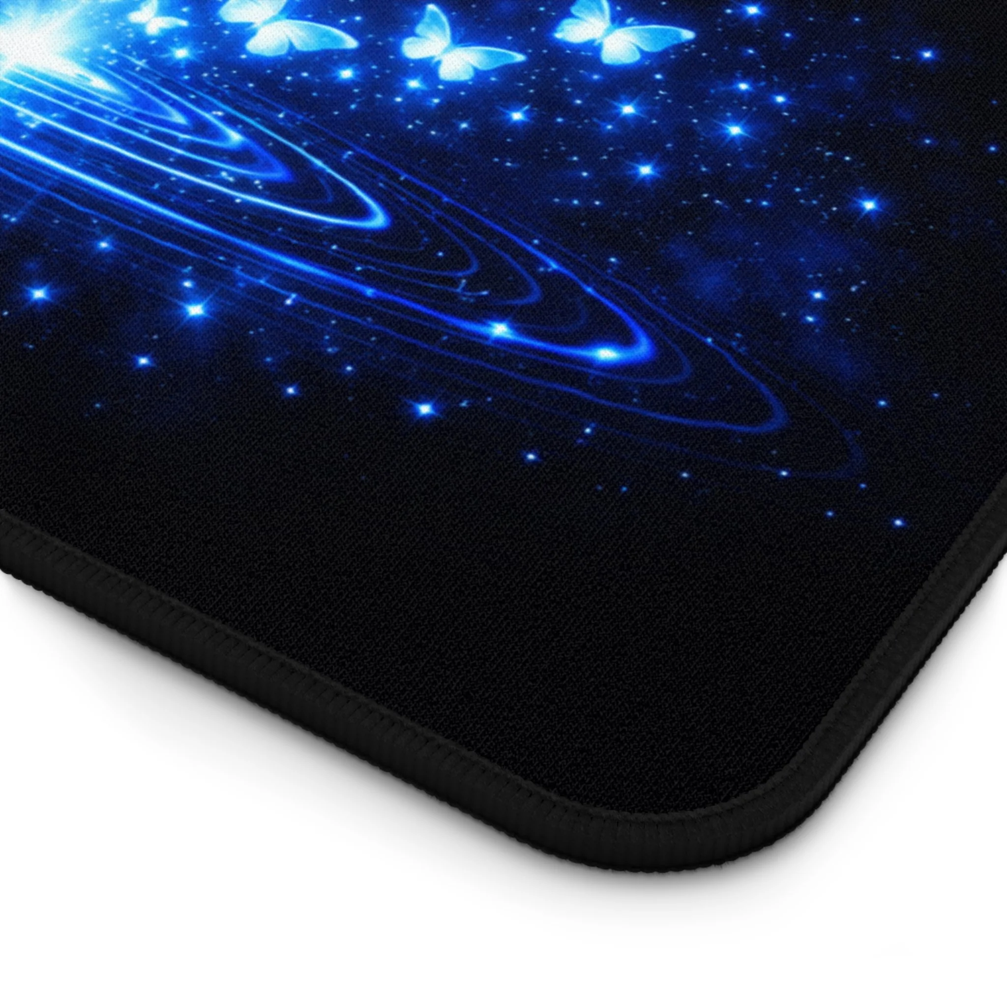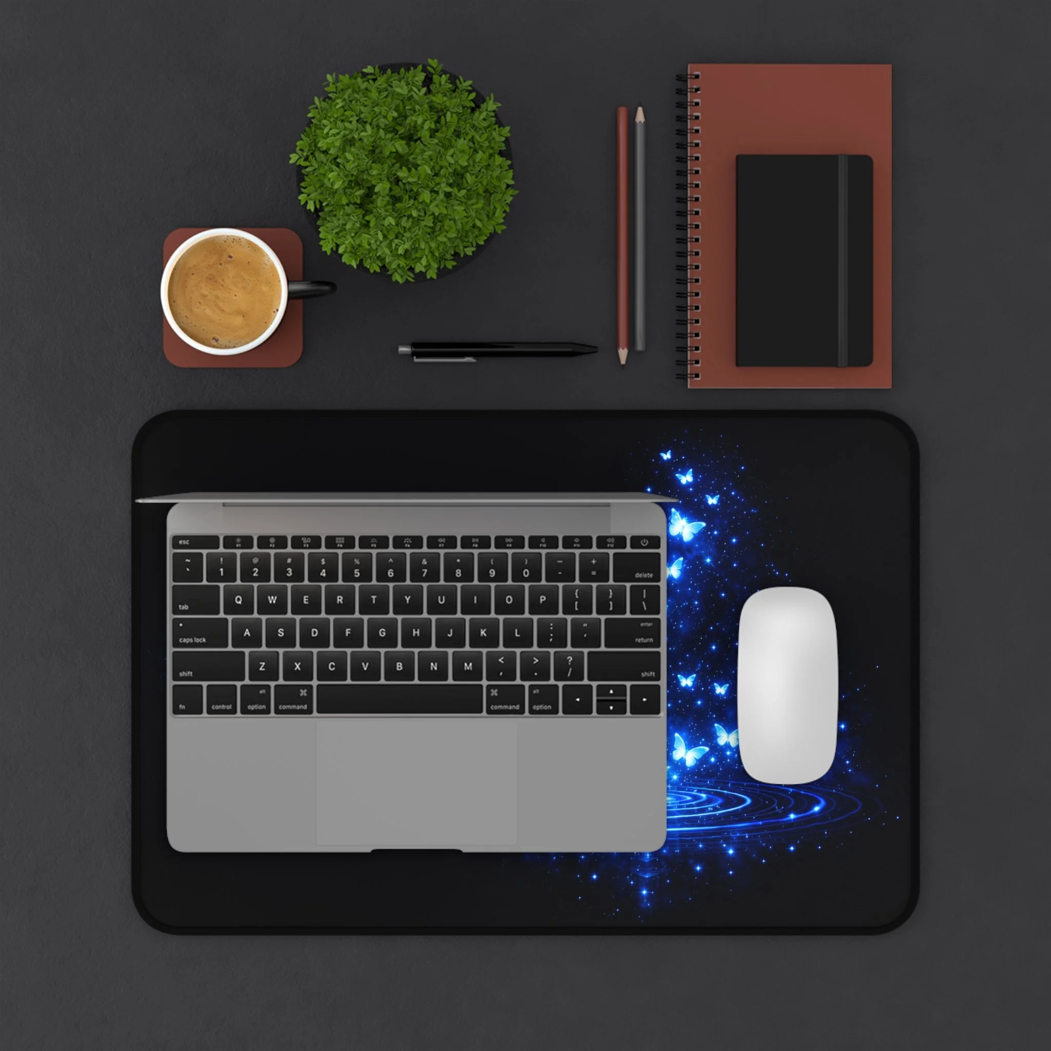 Set a quiet, magical mood at your desk with this neoprene desk mat. A cascade of electric-blue butterflies rises from a shimmering ripple, casting soft light against a deep black background. The smooth, vibrant print brings that moment of wonder into your workspace — whether you’re sketching ideas, typing through a late-night project, or arranging small craft pieces. The non-slip, anti-skid backing keeps the mat steady during focused work, and the reinforced hemmed edges hold up to daily use. Choose from three sizes to anchor your keyboard, tablet, and favorite tools while the glowing design keeps inspiration within reach.