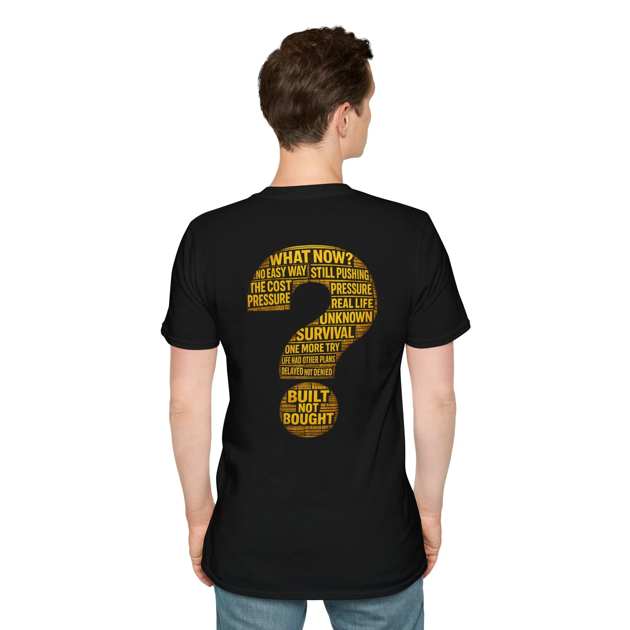 Metallic Gold Edition that speaks to anyone living inside a loop of paradox and perseverance. The front shows a distressed “CATCH 22” stamp — blunt, raw, unapologetic. The back folds into a large question-mark made of short, urgent phrases like “What now?”, “Pressure”, “Real life”, and “Survival”, forming a graphic that reads as both challenge and rallying call. Wear it when you want to name the tension instead of hiding it — on late-night shifts, at underground shows, or during long conversations with friends who get it. The shirt sits close to the body without clinging, drapes cleanly, and feels light enough for layered looks. It’s for people who appreciate dark, literate humor and want a piece that starts a conversation rather than a compliment.