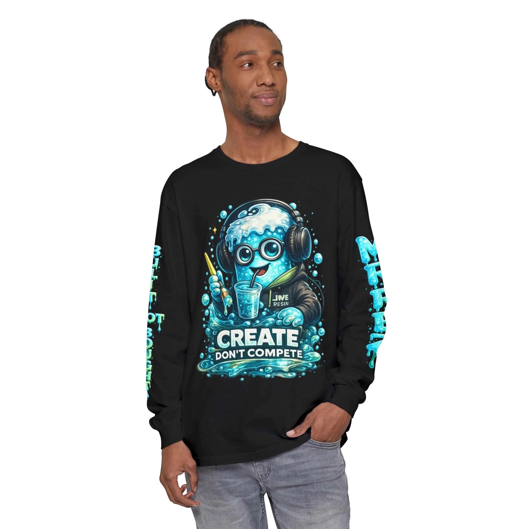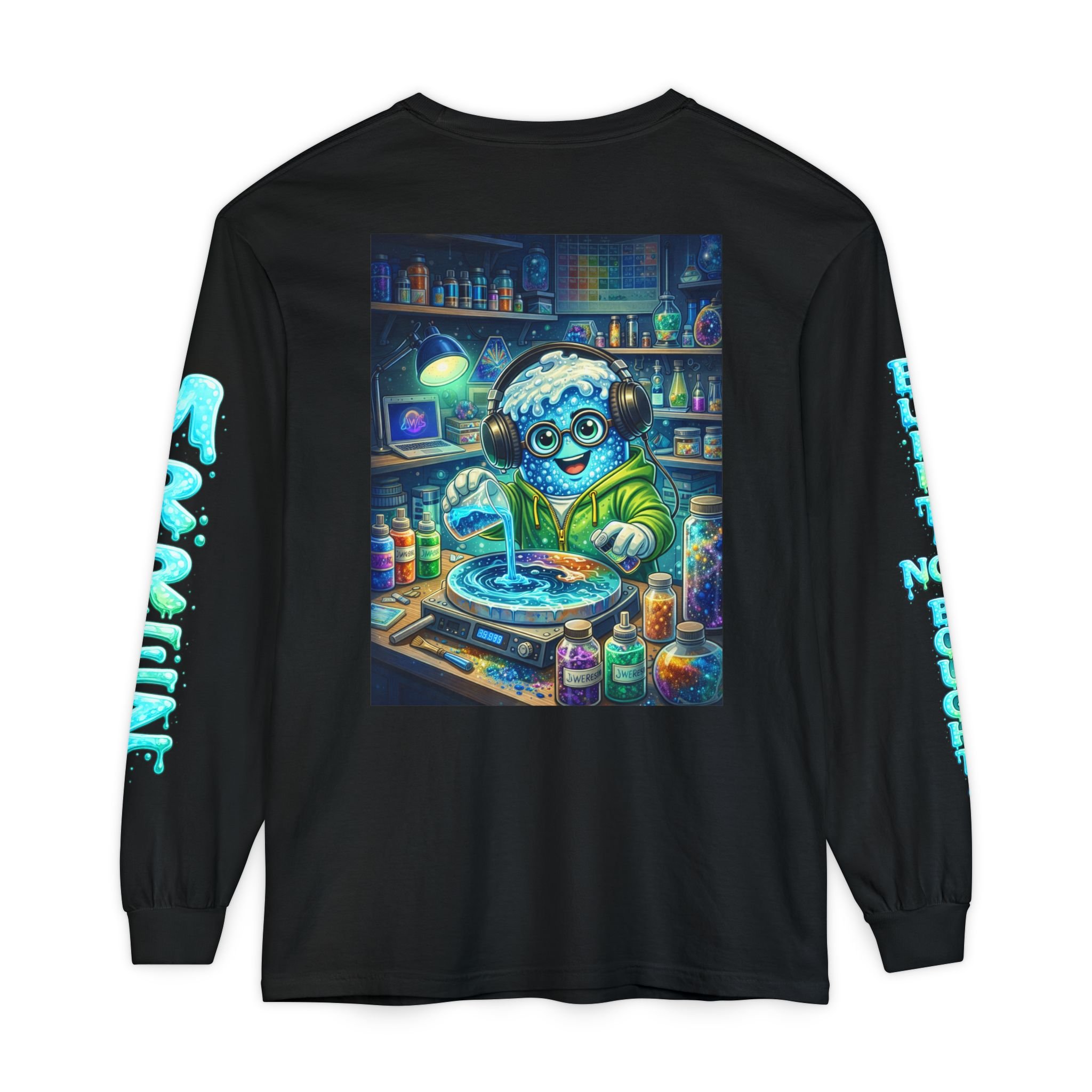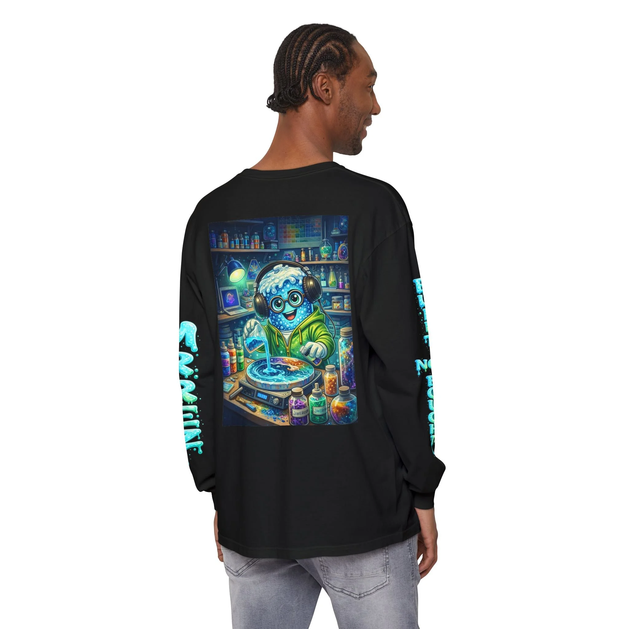 This garment-dyed long sleeve brings playful studio energy to your everyday wardrobe. A cheerful, bubble-headed character wearing headphones is printed large on the chest and back, mid-pour over a glowing palette of inks and bottles. Bright aqua and teal tones pop against the soft-dyed fabric, while matching sleeve graphics add movement when you walk. It feels lived-in from the first wear—soft, slightly faded color and medium-weight cotton that drapes comfortably. Wear it while sketching, mixing colors, or when you want your clothing to announce that making matters more than matching. It reads like a creative companion: warm, tactile, and a little mischievous.