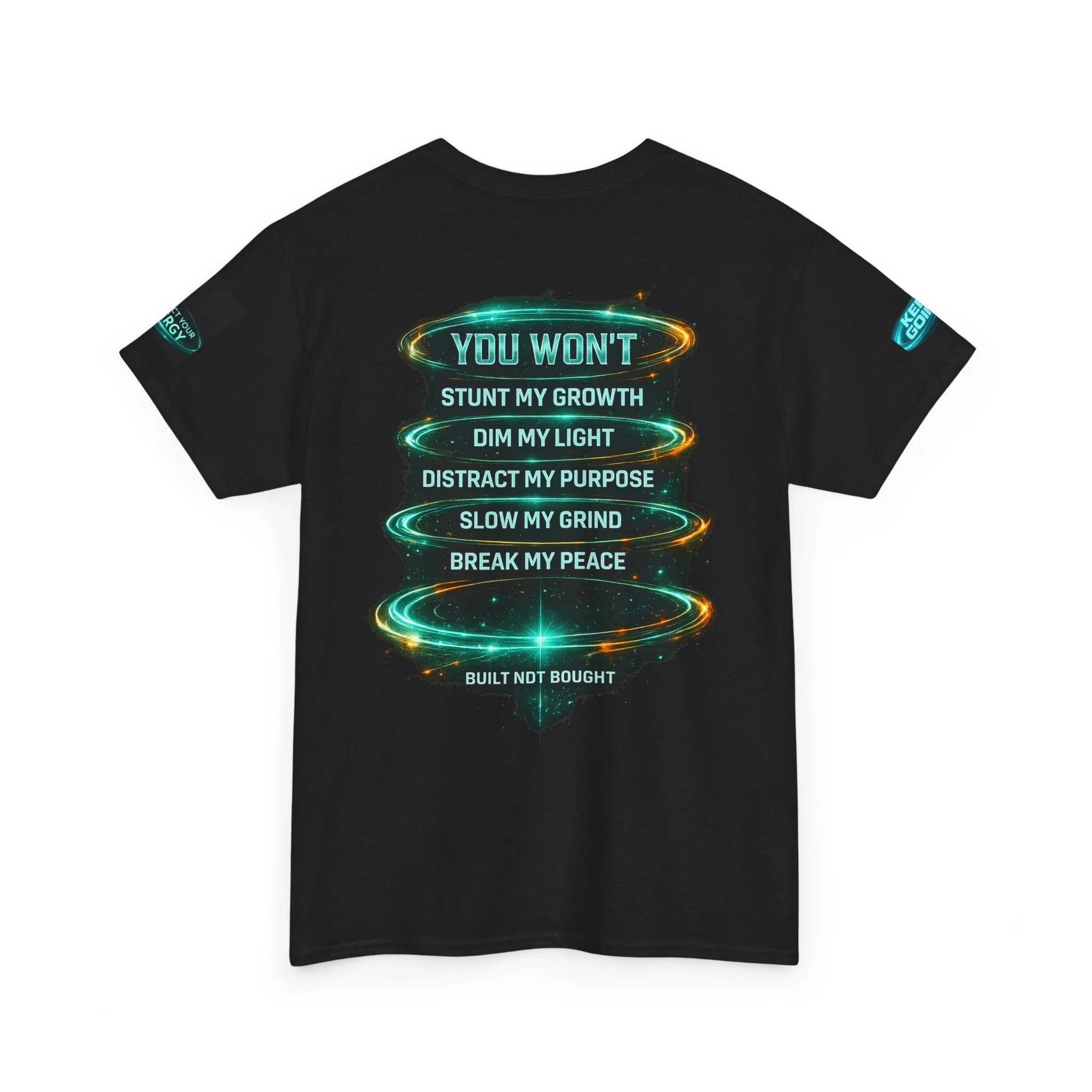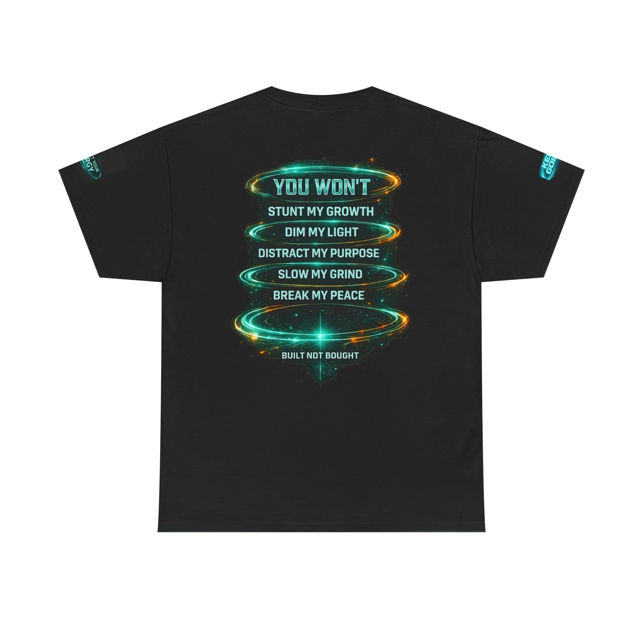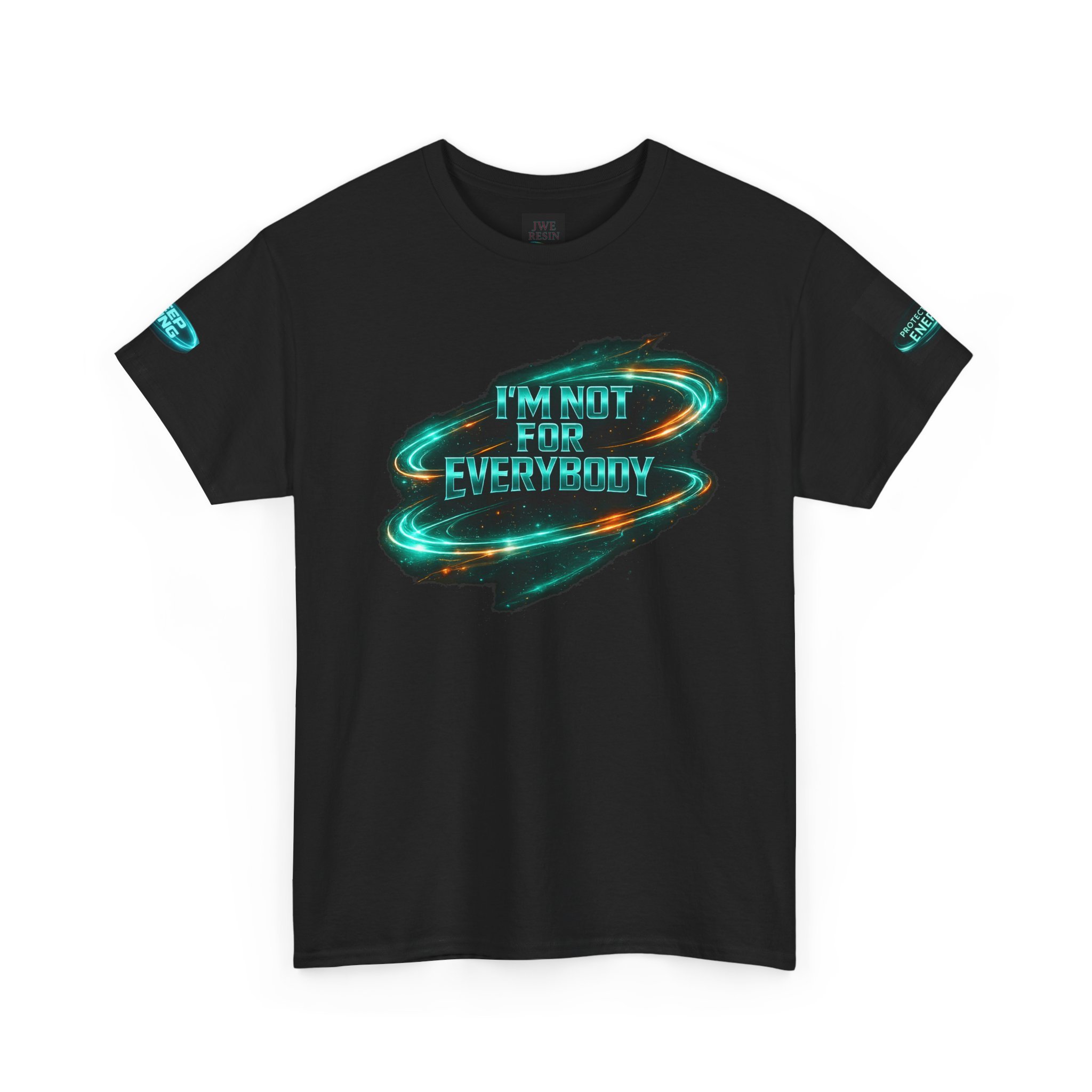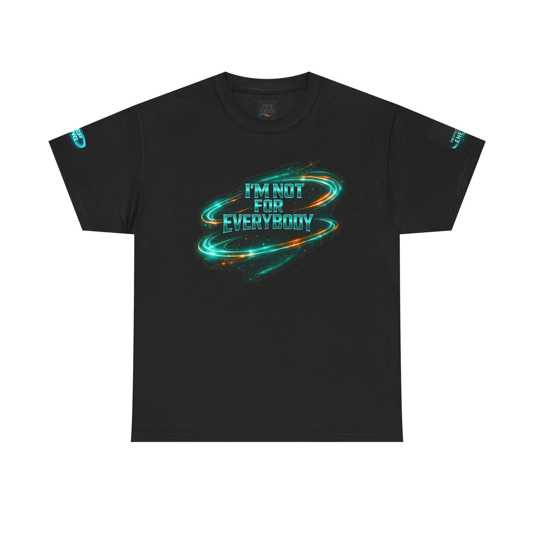 This classic cotton tee carries bold energy — a midnight-black canvas with electric blue, sci-fi inspired lettering declaring confidence: "I'M NOT FOR EVERYBODY" across the chest and a stacked manifesto on the back listing what won’t be allowed to hold you back. The graphic feels cinematic and defiant, like a personal anthem you can wear to amplify boundaries and celebrate steady growth. It sits comfortably through long days thanks to a relaxed, classic fit and soft, durable fabric. Wear it on nights out, during studio sessions, or while pushing through a creative grind — it reads like a quiet roar that says you choose your own path.