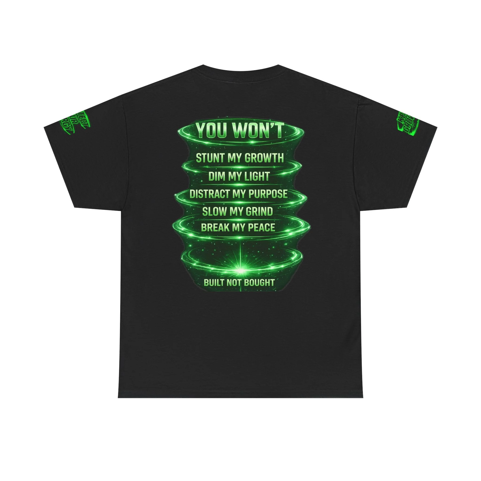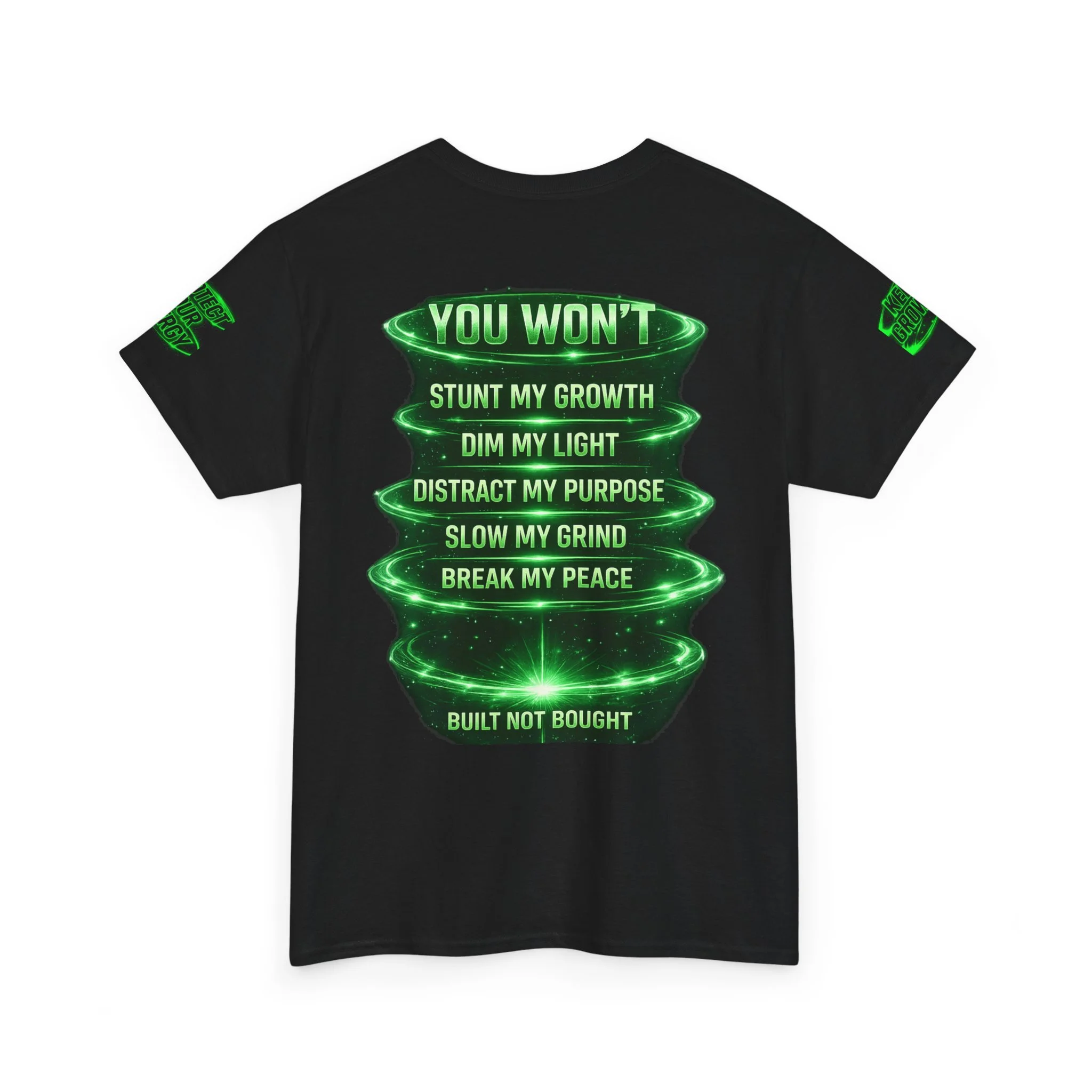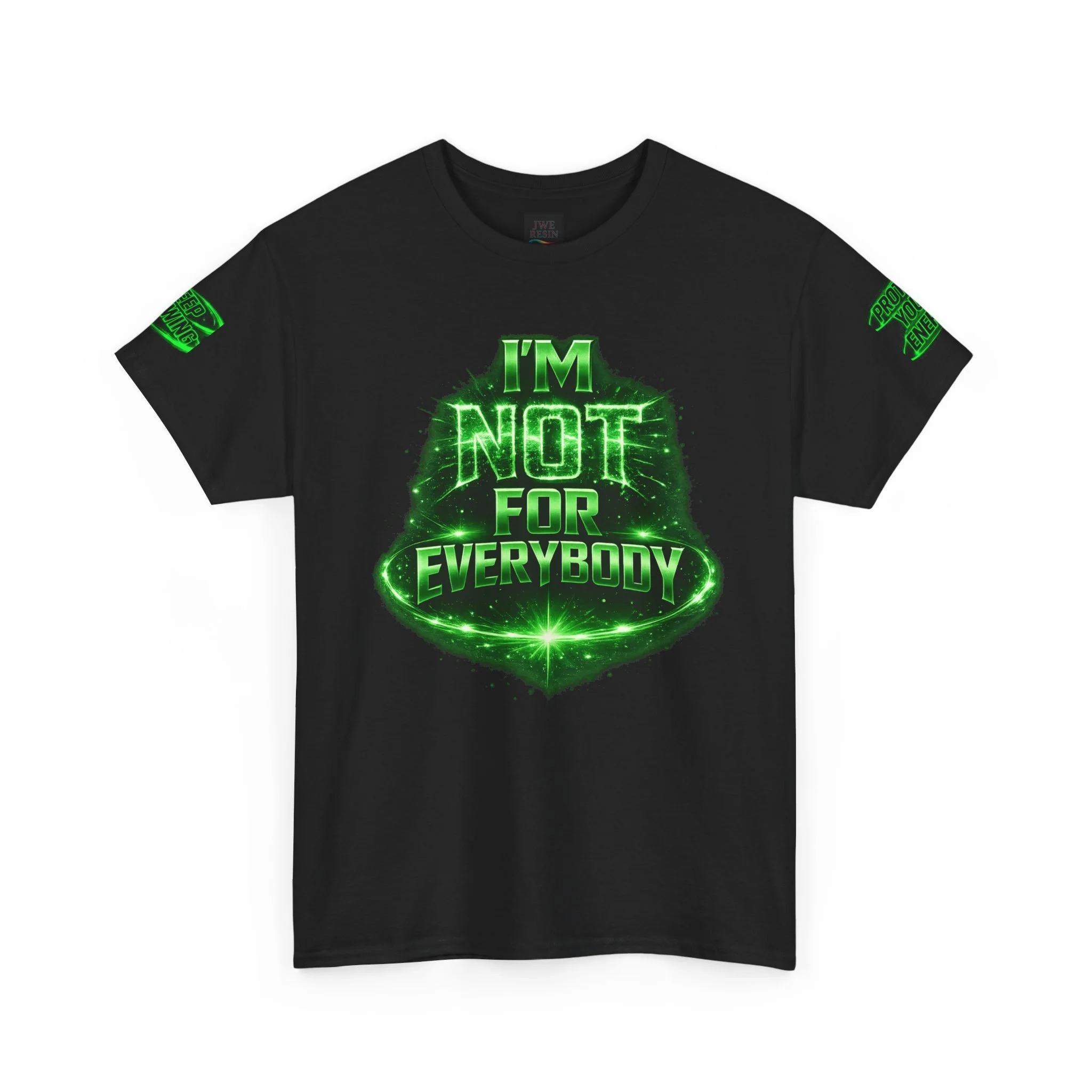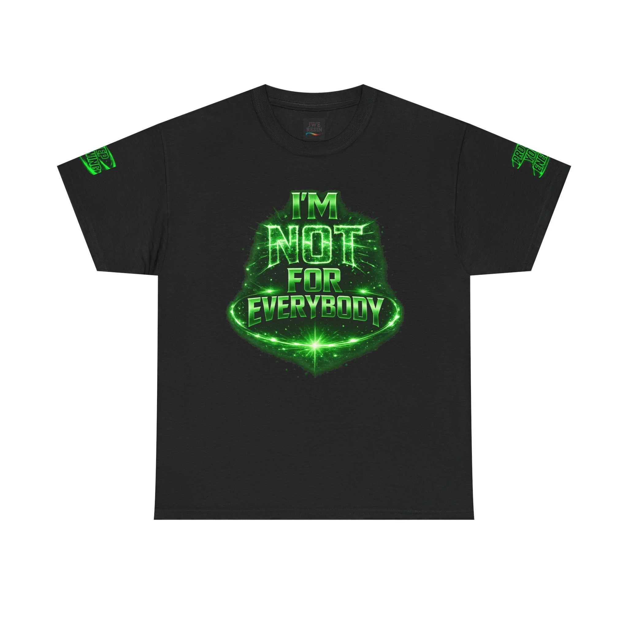 This classic cotton tee carries bold energy — a midnight-black canvas with electric blue, sci-fi inspired lettering declaring confidence: "I'M NOT FOR EVERYBODY" across the chest and a stacked manifesto on the back listing what won’t be allowed to hold you back. The graphic feels cinematic and defiant, like a personal anthem you can wear to amplify boundaries and celebrate steady growth. It sits comfortably through long days thanks to a relaxed, classic fit and soft, durable fabric. Wear it on nights out, during studio sessions, or while pushing through a creative grind — it reads like a quiet roar that says you choose your own path.