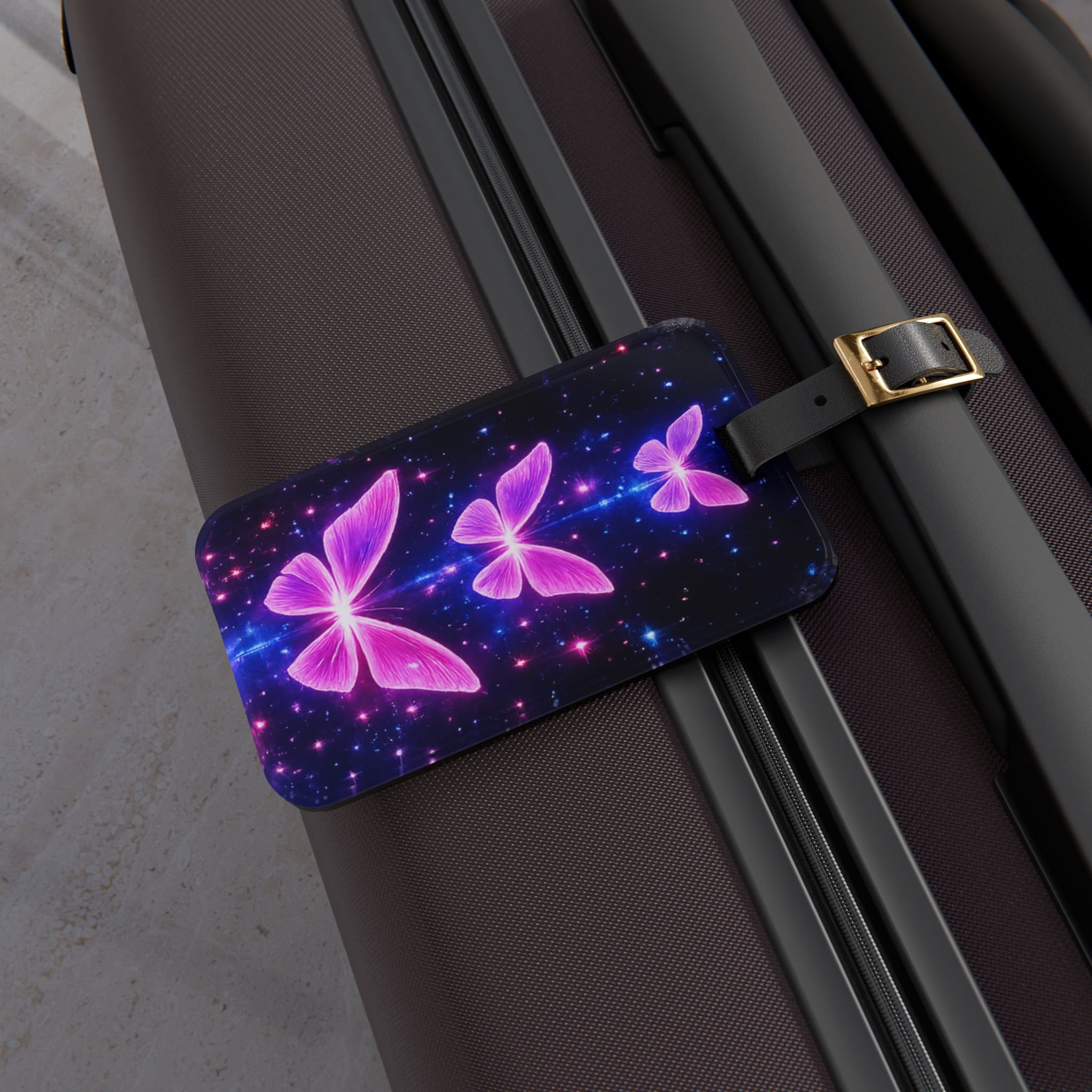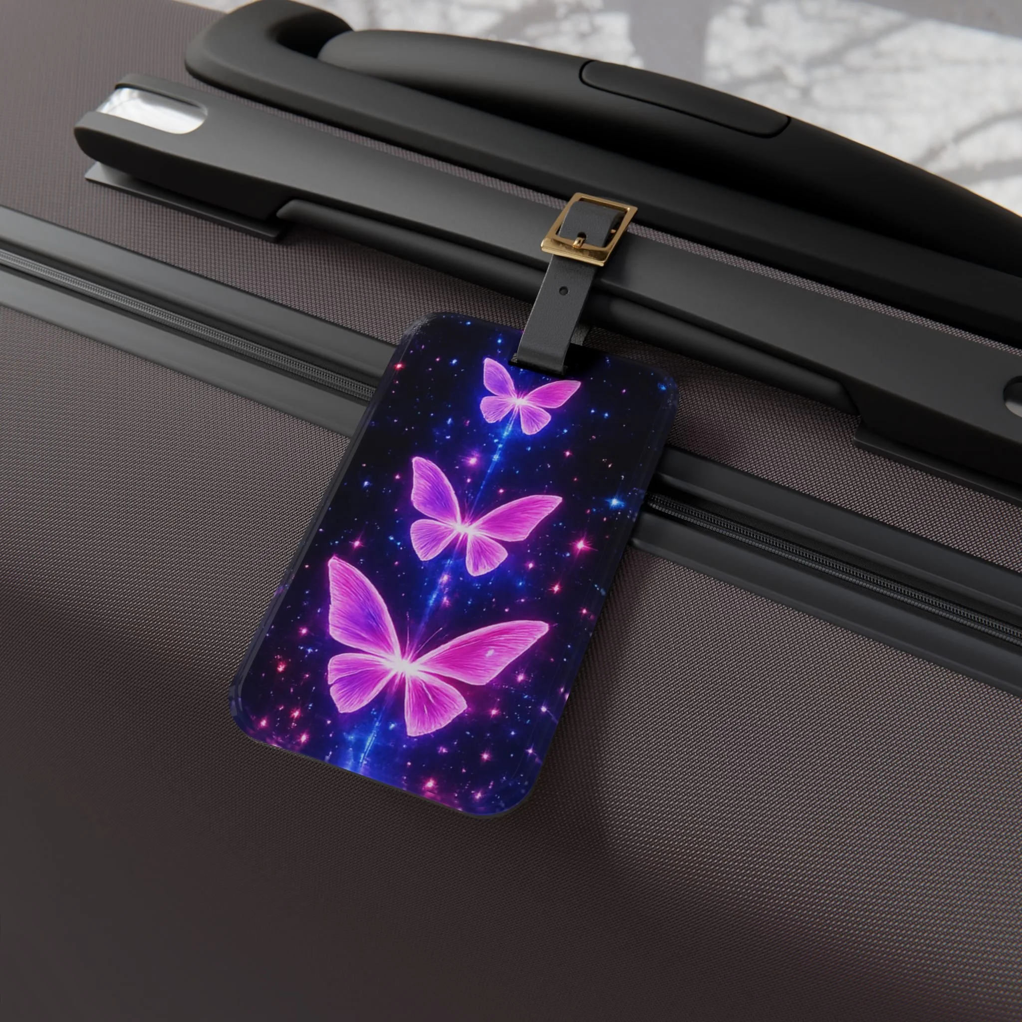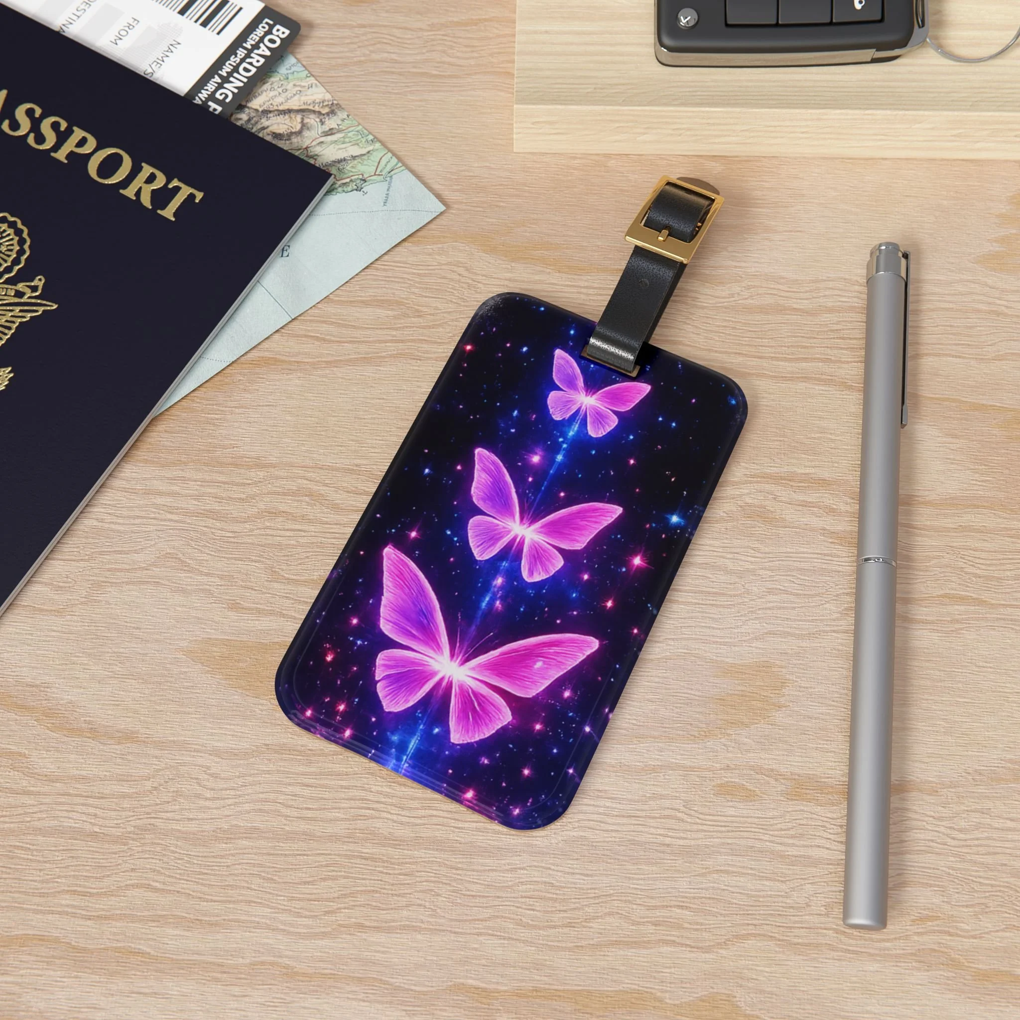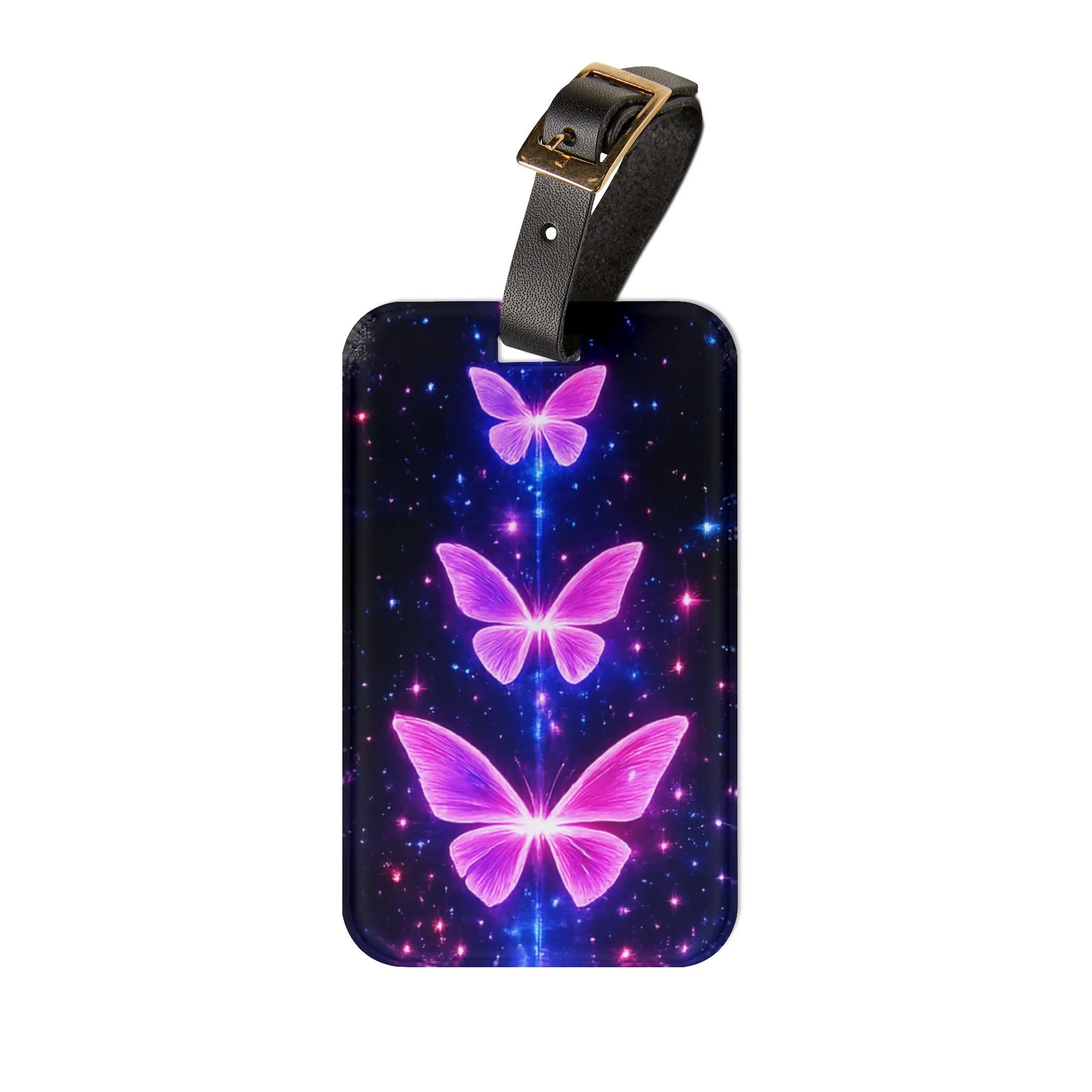 Add a bright personal touch to your travels with this Neon Butterfly Luggage Tag. Featuring glowing pink and purple butterflies on a deep black background, it makes your suitcase, carry-on, or travel bag easier to spot while adding bold style at the same time. Lightweight and eye-catching, it’s a simple travel accessory that helps your luggage stand out wherever you go. Perfect for frequent travelers or anyone who loves colorful, expressive details.