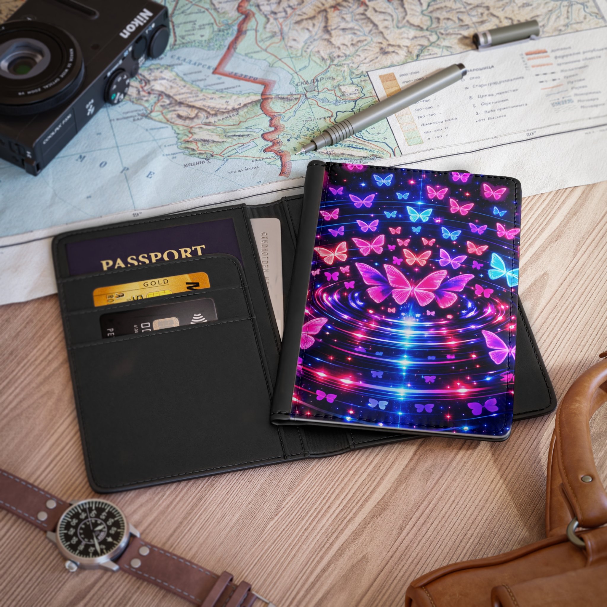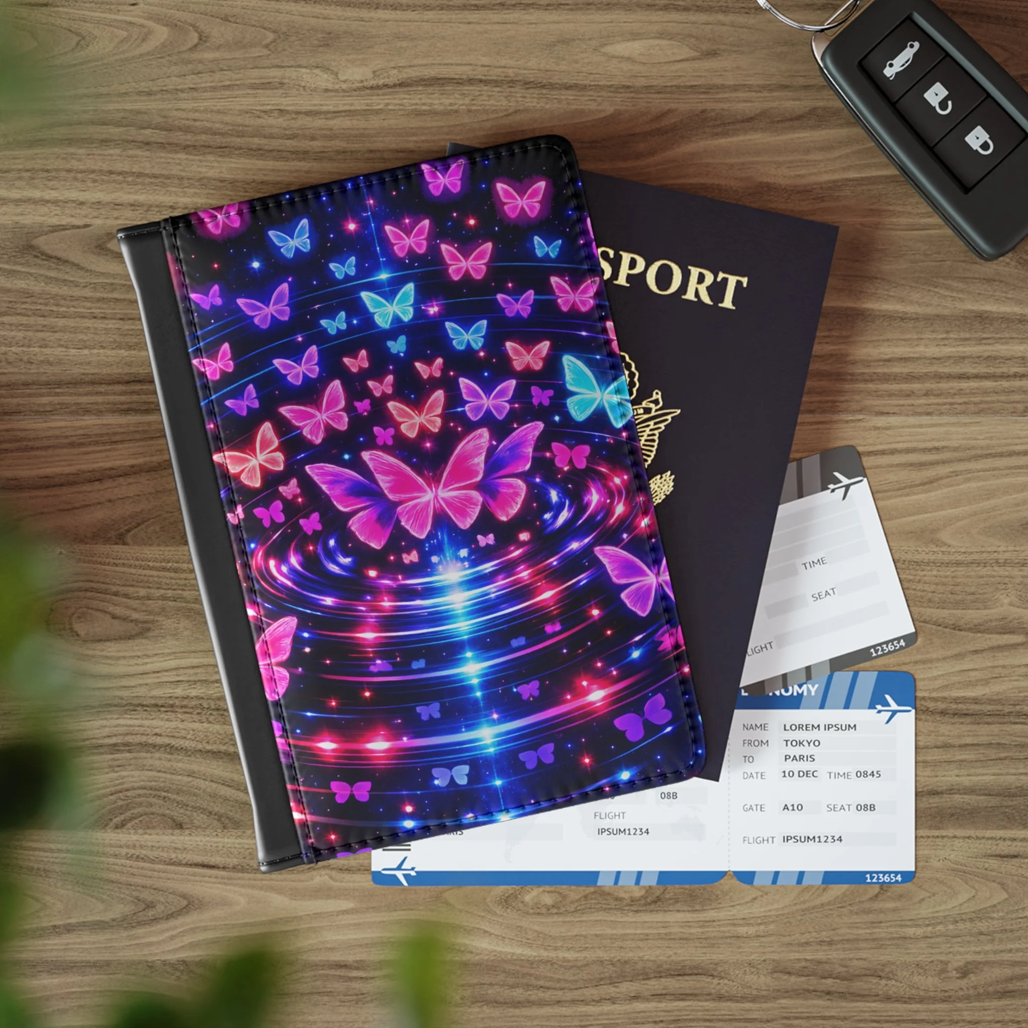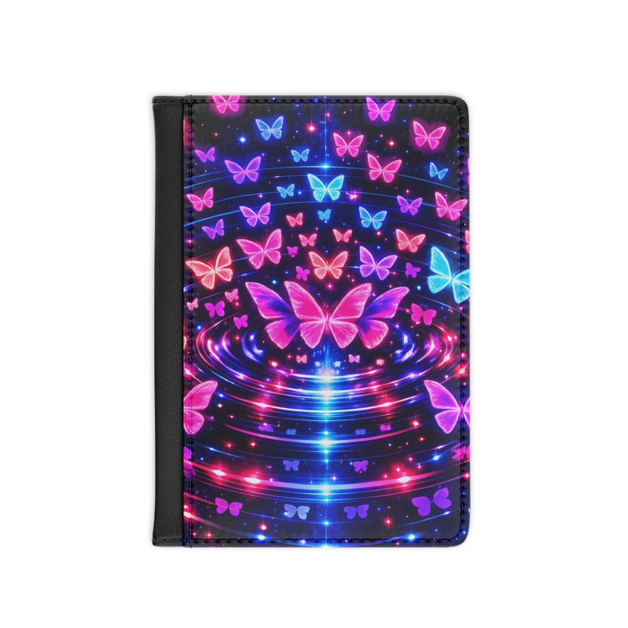 Travel in style with this Neon Butterfly Passport Cover, designed to add bold color and personality to your journey. Featuring glowing pink and blue butterflies on a deep black background, this cover brings a vibrant, eye-catching look to your travel essentials. Slim and functional, it helps keep your passport protected while making it easy to spot in your bag or carry-on. Perfect for travelers who love unique accessories with a bright, expressive design.