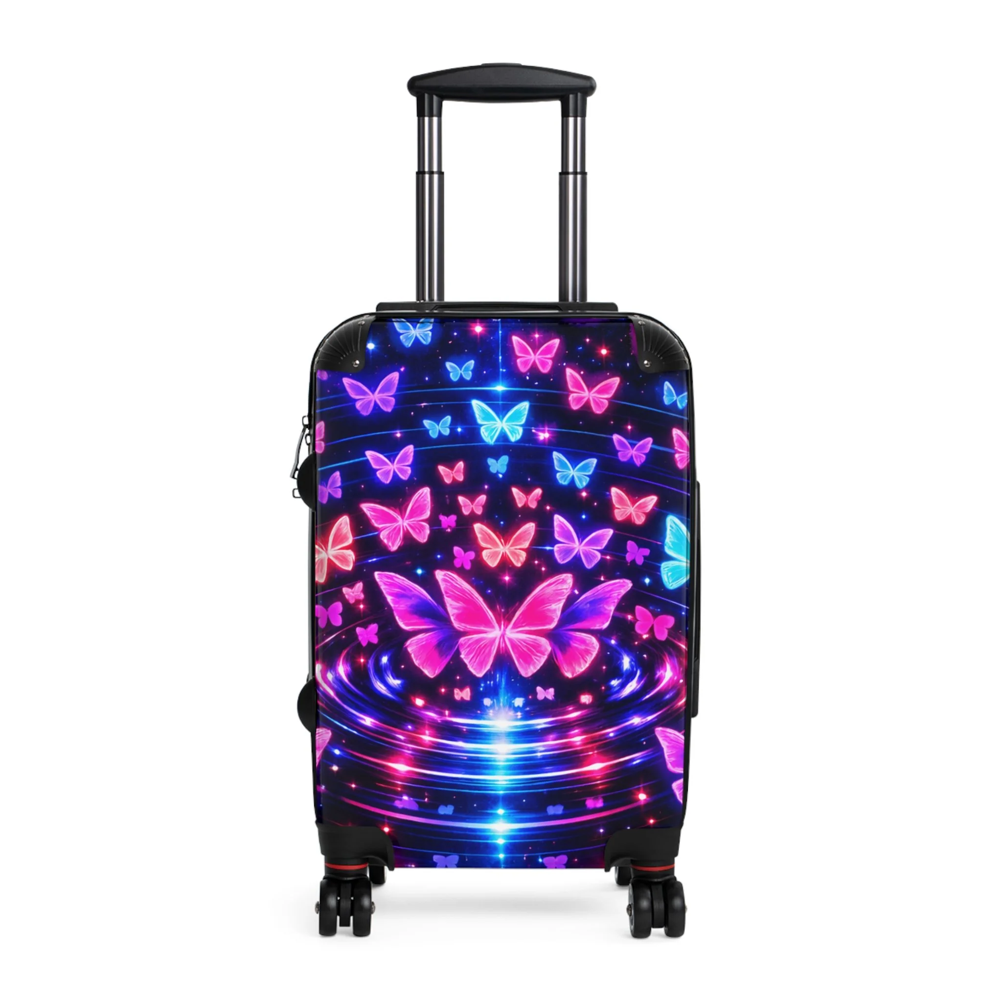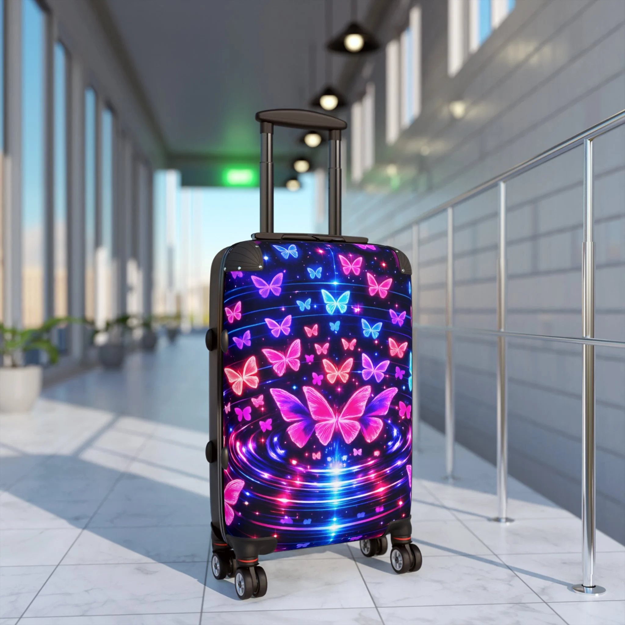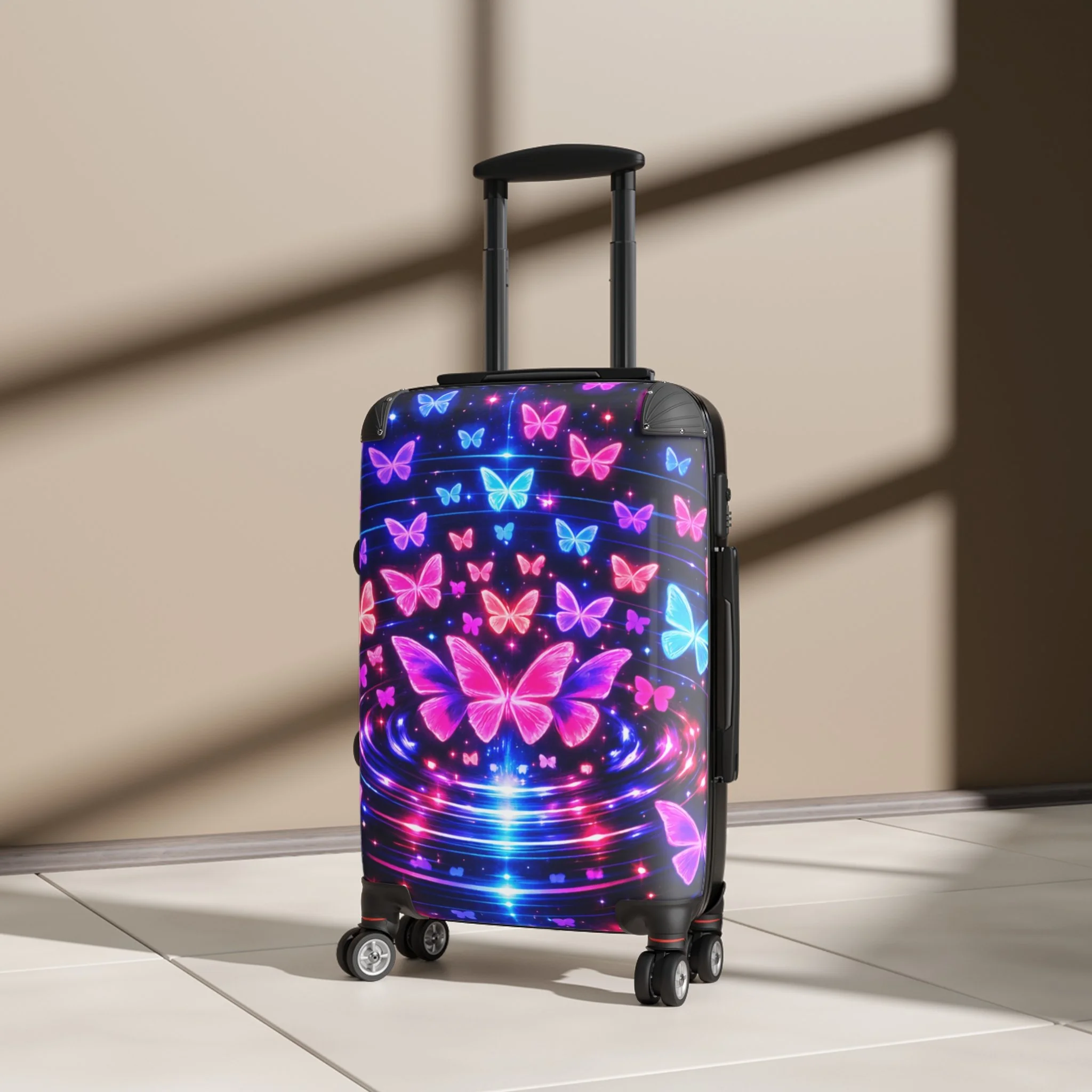 Travel bold with this Neon Butterfly Suitcase, designed to turn every trip into a statement. Featuring glowing pink and blue butterflies on a deep black background, this hard shell luggage combines eye-catching style with travel-ready function. Built for movement and made to stand out, it offers a sleek look that’s easy to spot at the airport, on the road, or wherever your journey takes you. Perfect for travelers who want practical luggage with vibrant personality.